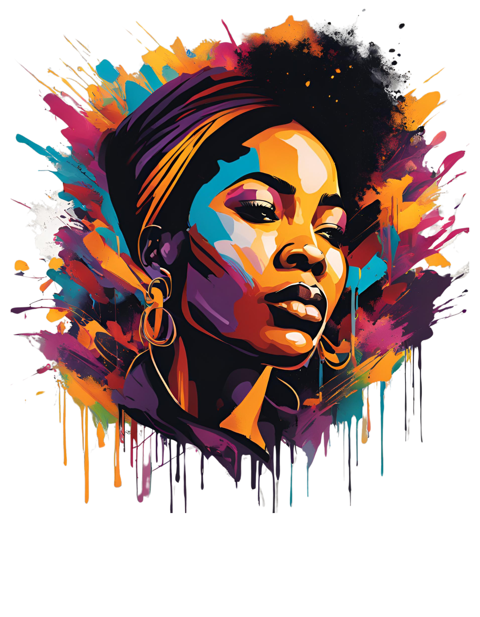 A statement piece celebrating the strength, beauty, and brilliance of Black culture. This vibrant portrait design fuses streetwear and abstract art, featuring a powerful depiction of a Black woman surrounded by explosive color, energy, and spirit. Perfect for those who wear their identity with pride.