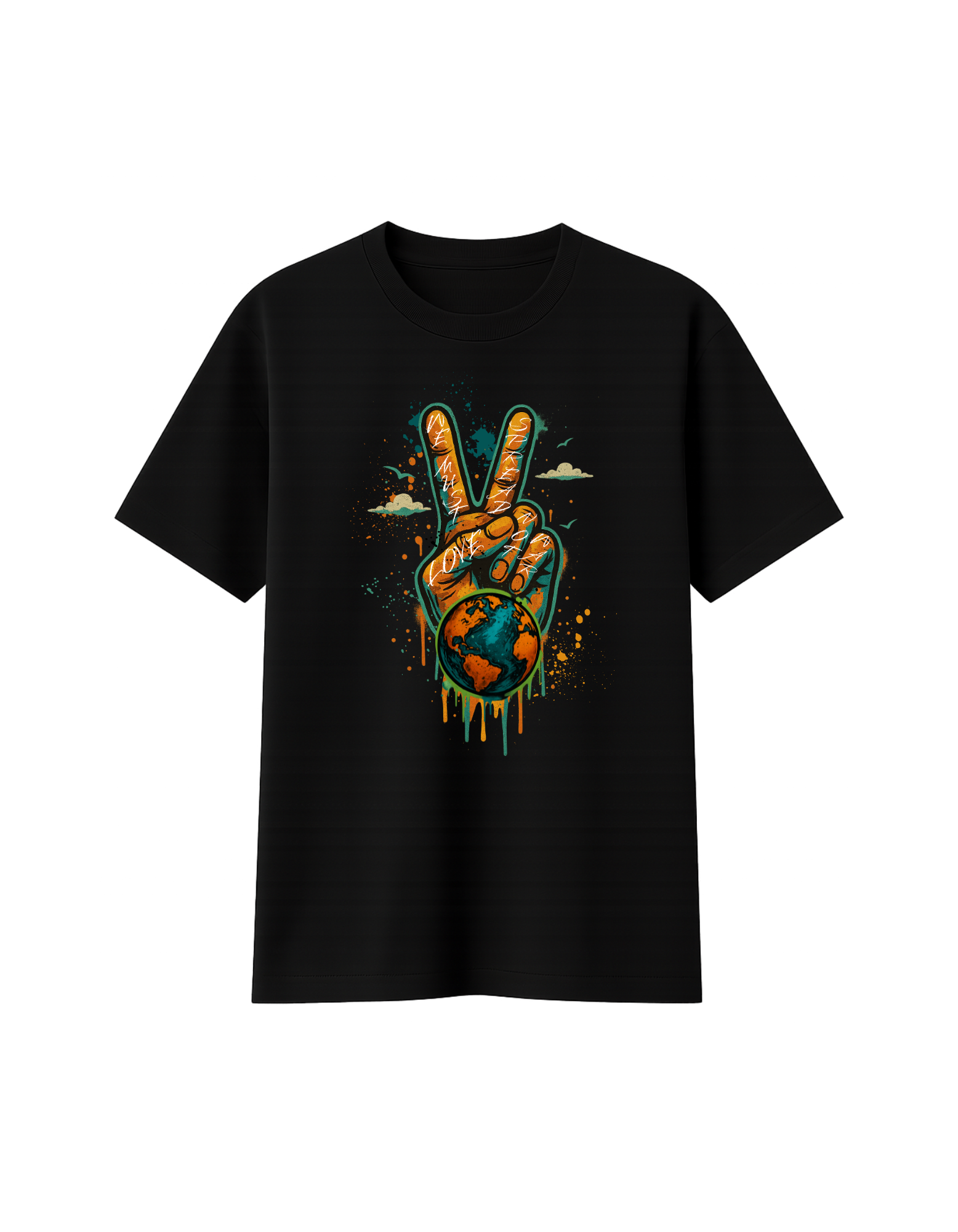 It’s a movement. The Spread Love, Not War tee fuses bold streetwear energy with a message the world needs now more than ever. Front and center is our striking design: a vibrant, graffiti-style peace sign wrapped around the Earth, dripping with raw truth and power. It’s a call to lead with compassion, to fight hate with humanity, and to rise above the chaos with courage.